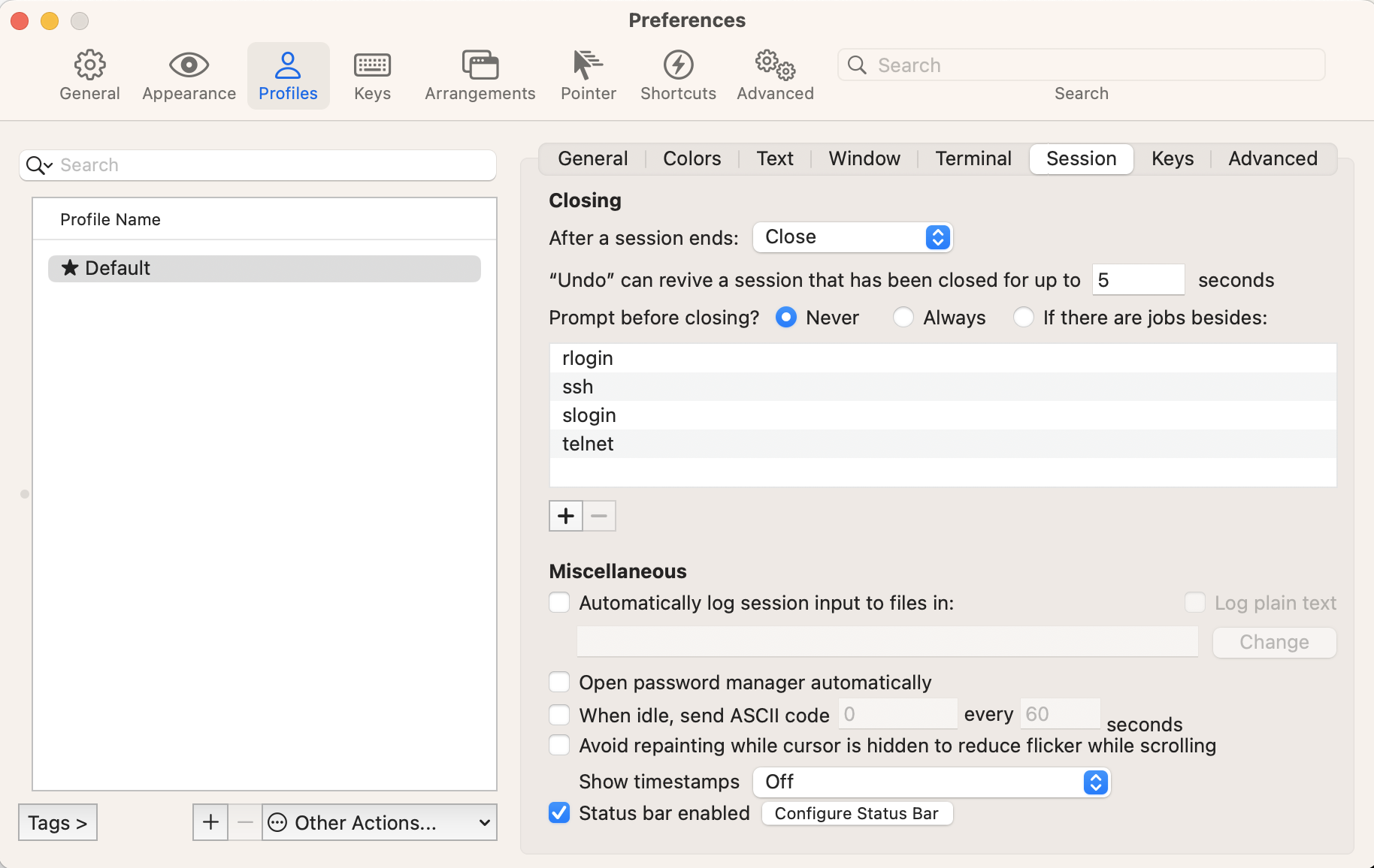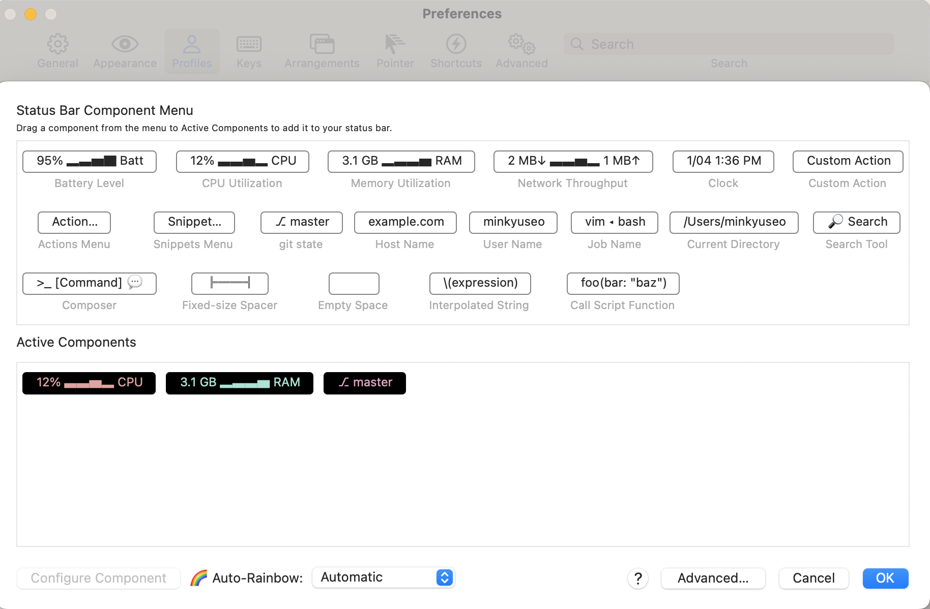 3-2. Configure Status Bar클릭 후 Iterm 창에 필요한 스태터스바를 아래쪽 Active Components에 Drag & Drop한다